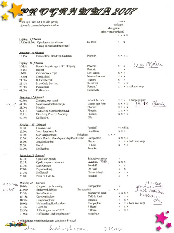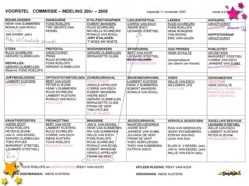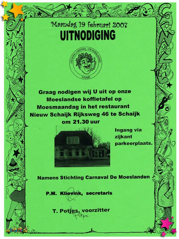 Tot slot bevat het archief van 2007 weer een mooie verzameling flyers van carnavalsclubs, die tijdens de optocht werden uitgedeeld. Deze flyers, vol slogans, knipogen, uitnodigingen en creatieve vondsten, tonen hoe elke club zich op haar eigen manier presenteerde aan het publiek, met een lach, een knipoog en een flinke dosis Moeslands karakter.