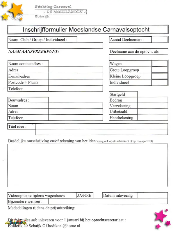 Als je mee wilt doen aan de schonste optocht van hiejel de wirreld, dien je jezelf in te schrijven. En dat kan met dit formulier. Tegenwoordig gebeurt dit allemaal online.