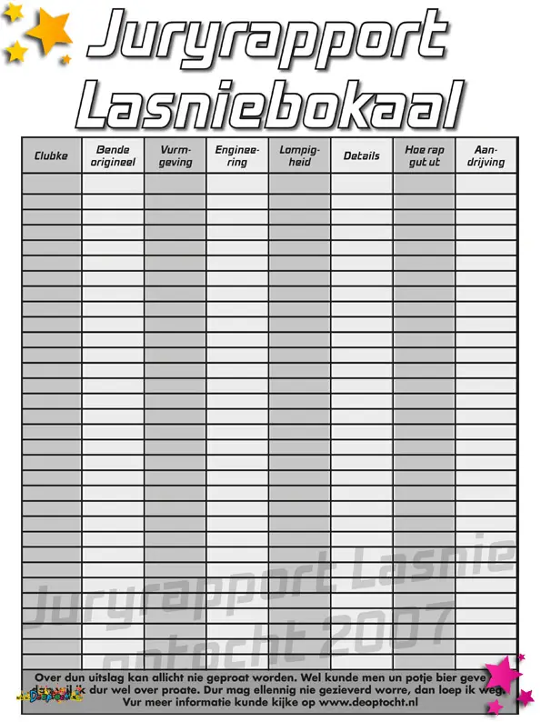 Een bijzonder document uit dit jaar is het juryrapport voor de Lasniebokaal. Deze bokaal werd in het leven geroepen als ode aan de lassers, die vaak buiten beeld blijven, maar letterlijk en figuurlijk de basis vormen van elke carnavalswagen. De Lasniebokaal werd toegekend aan de club met de mooiste of meest opvallende beweging in de wagen, iets wat alleen met vakmanschap, precisie en heel wat lasuren mogelijk is.
