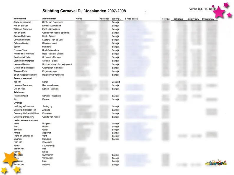 De ledenlijst van Stichting Carnaval de Moeslanden.