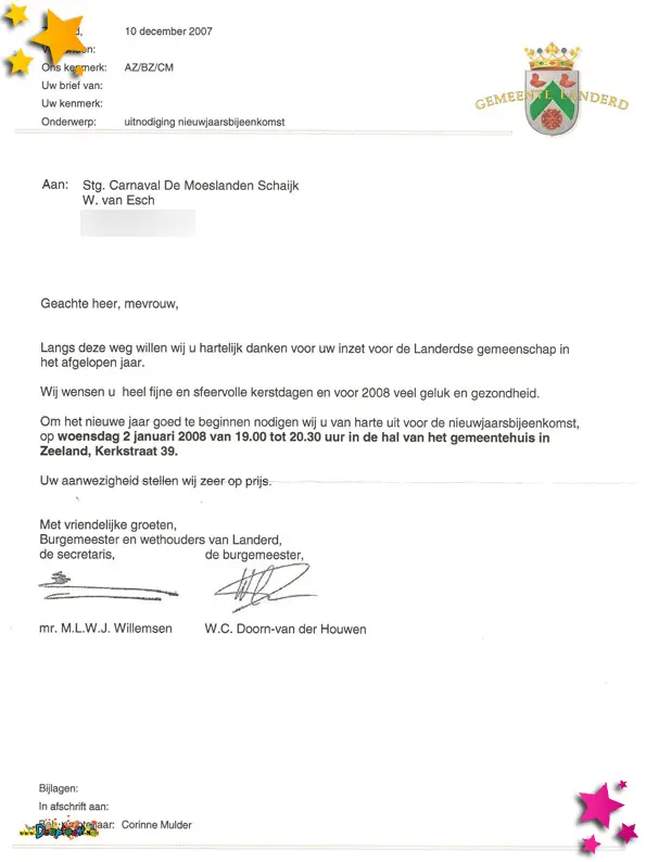 De uitnodiging voor de nieuwjaarsbijeenkomst van de gemeente Landerd.