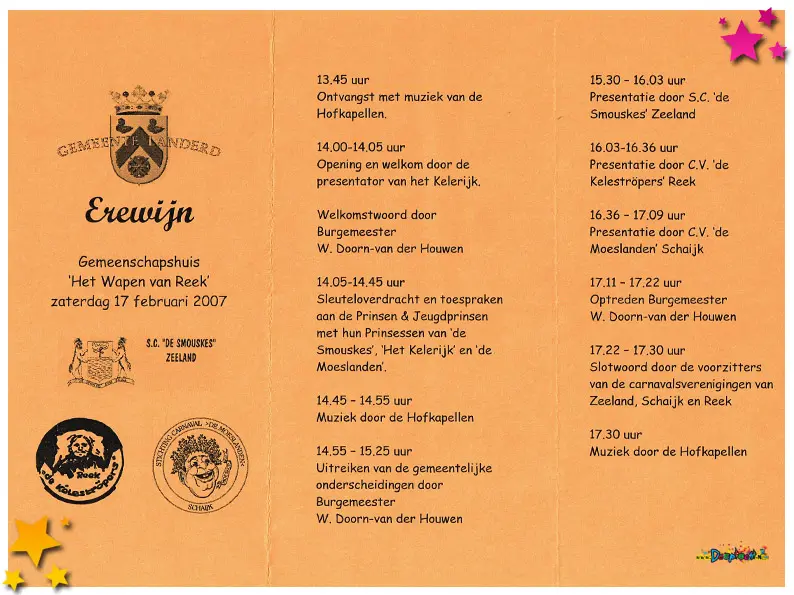 De sleuteloverdracht (Erewijn) werd in 2007 in het Wapen van Reek gehouden. Dit is de uitnodiging en het programma van de Erewijn.