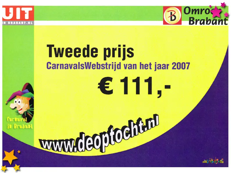 Als je iets gewonnen hebt, dan moet je dat altijd verdedigen. Zo gezegd zo gedaan, de website www.deoptocht.nl wederom ingeschreven voor de beste carnavalswebsiteverkiezing bij Omroep Brabant. Deze keer werd de site tweede. Hieronder het juryrapport en het bijbehorende certificaat.