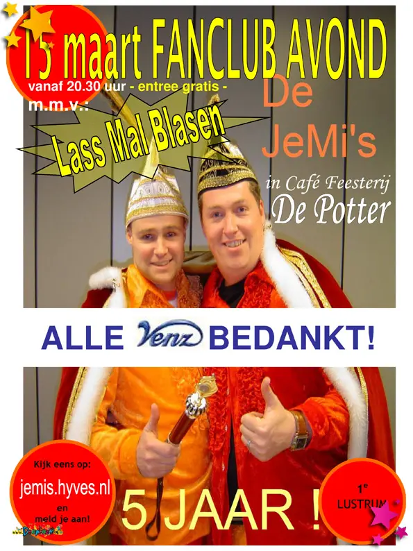 De JeMi’s, beter bekend als Jeroen van Zuijlen en Michiel Jans, vierden in 2008 hun 5 jarig lustrum.