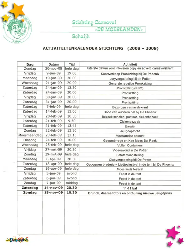 De activiteitenkalender van Stichting Carnaval de Moeslanden.