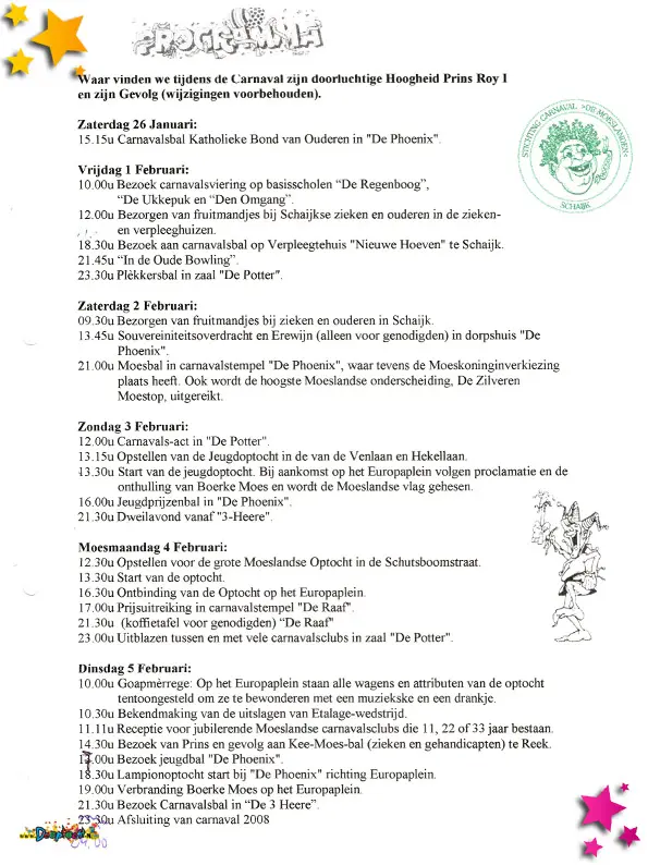 Het carnavalsprogramma van Stichting Carnaval de Moeslanden in 2008.