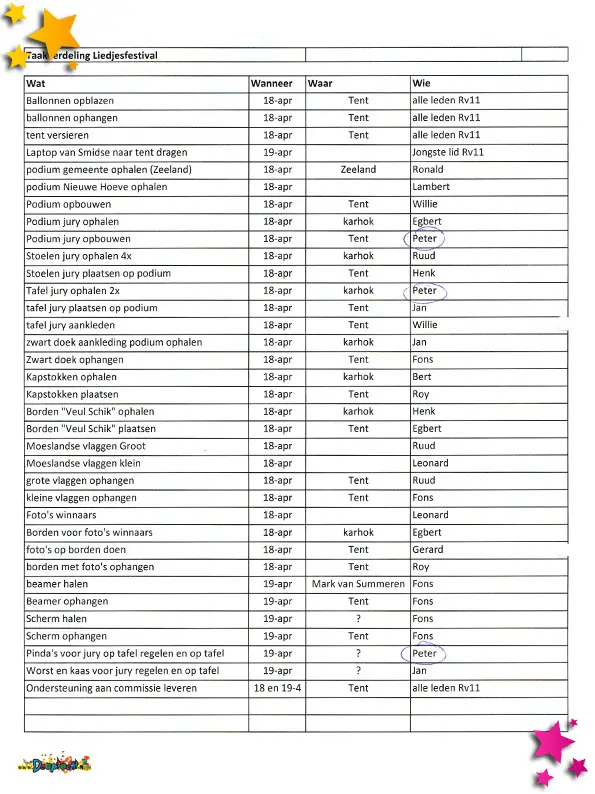 De taakverdeling voor het liedjesfestival.