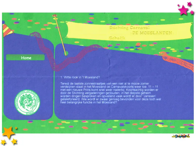 Een van de belangrijkste documenten uit dit jaar is de layout voor de allereerste officiële website van Stichting Carnaval De Moeslanden. Met deze stap zette de stichting haar eerste serieuze schreden op het world wide web. De layout vormde het digitale uithangbord van het carnaval. Het is een mooi voorbeeld van hoe traditie en technologie samenkwamen om de gemeenschap nog beter te informeren en verbinden.