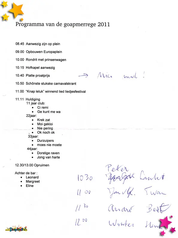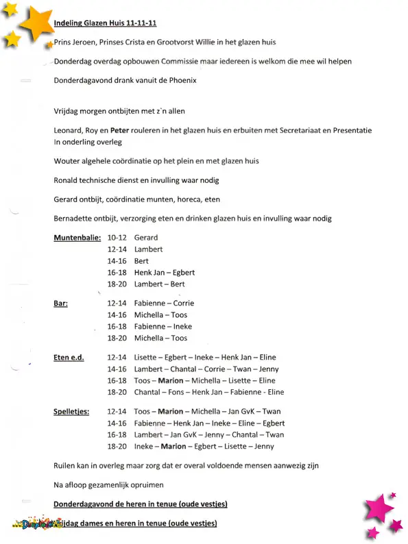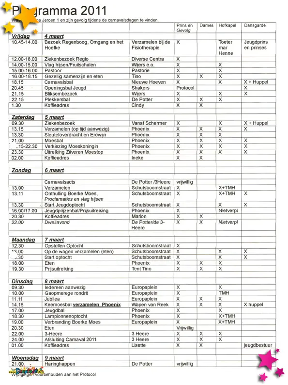 De taakverdeling voor de Moeslandse pronkzittingen van 2011.
