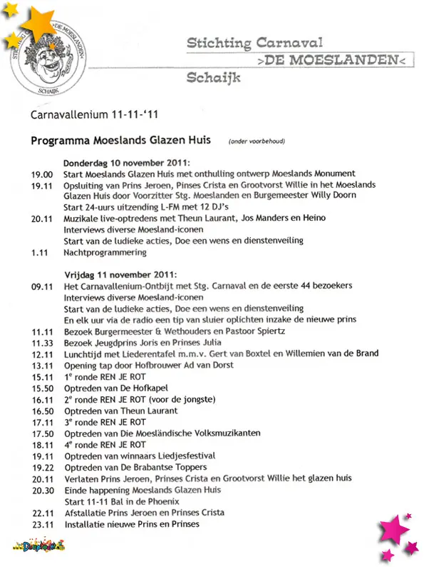 2011 was een jaar waarin het Moesland opnieuw bewees dat achter elk feest, elke show en elke optocht een gedreven organisatie en een heldere structuur schuilgaat. De documenten uit dit jaar onderstrepen het belang van duidelijke afspraken, vrijwillige inzet én het bewaken van de Moeslandse uitstraling.