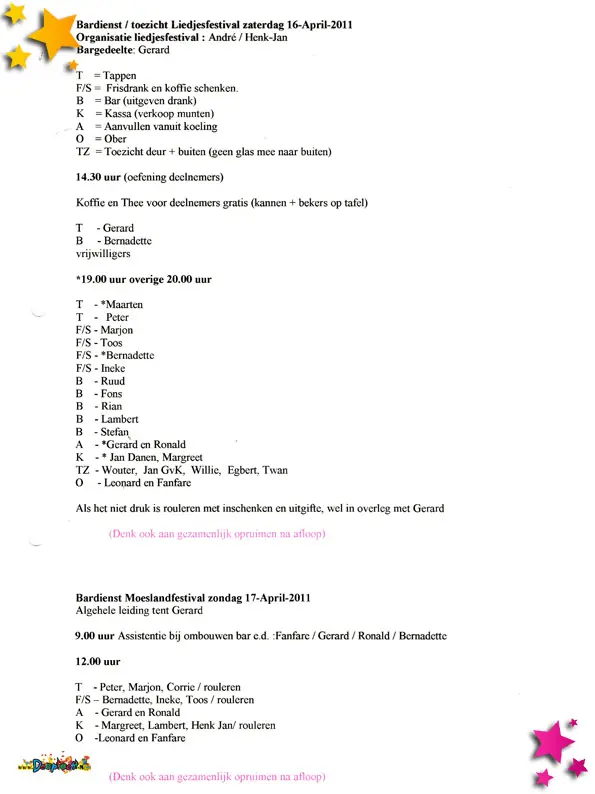 De taakverdeling voor het Moeslands Liedjesfestival.