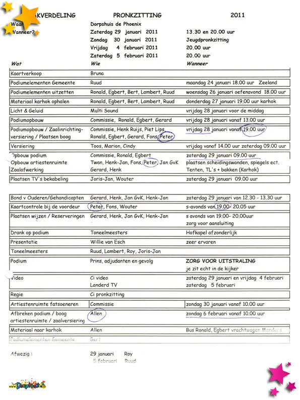 Een document in het archief is de taakverdeling voor de pronkzittingen van Schaijk. Deze toonaangevende avond staat al jaren bekend om zijn hoge kwaliteit en strakke regie. De lijst laat zien dat zonder vrijwilligers geen pronkzitting mogelijk is. Het document biedt een overzicht van alles wat er op de achtergrond gebeurt om die ene avond vlekkeloos te laten verlopen.