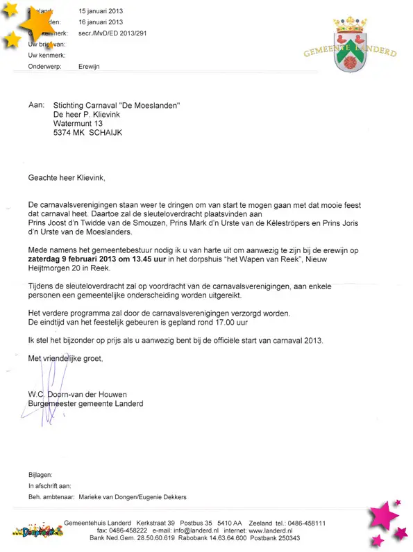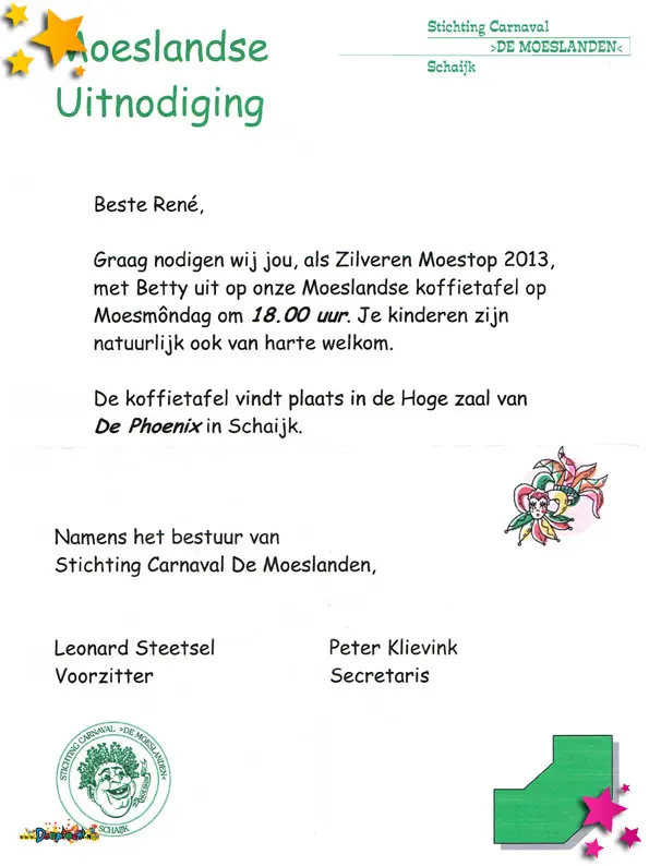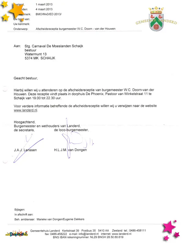 Stichting carnaval de Moeslanden is uitgenodigd voor de afscheidsreceptie van burgemeester Doorn.