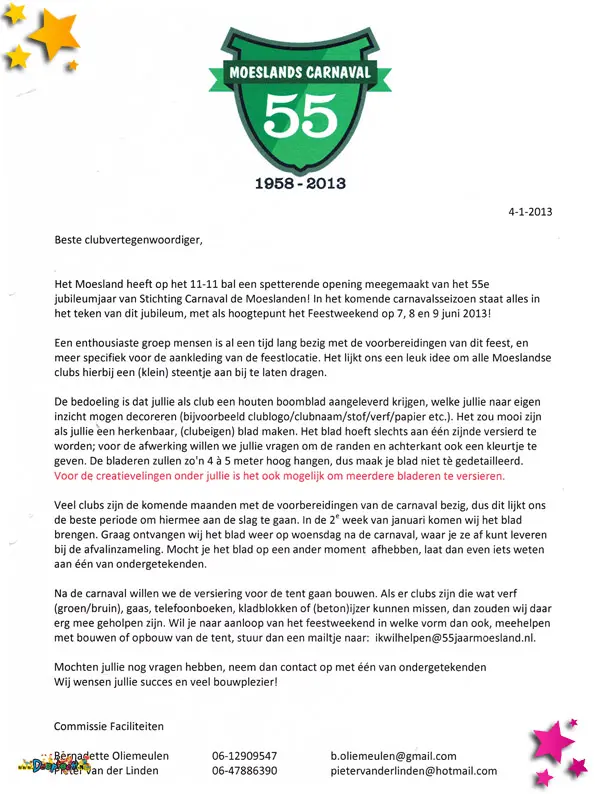 Een brief aan de clubs om te vragen of ze hun creativiteit willen gebruiken om de feesttent mee te versieren.