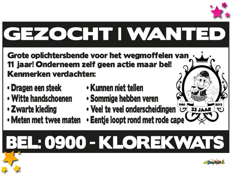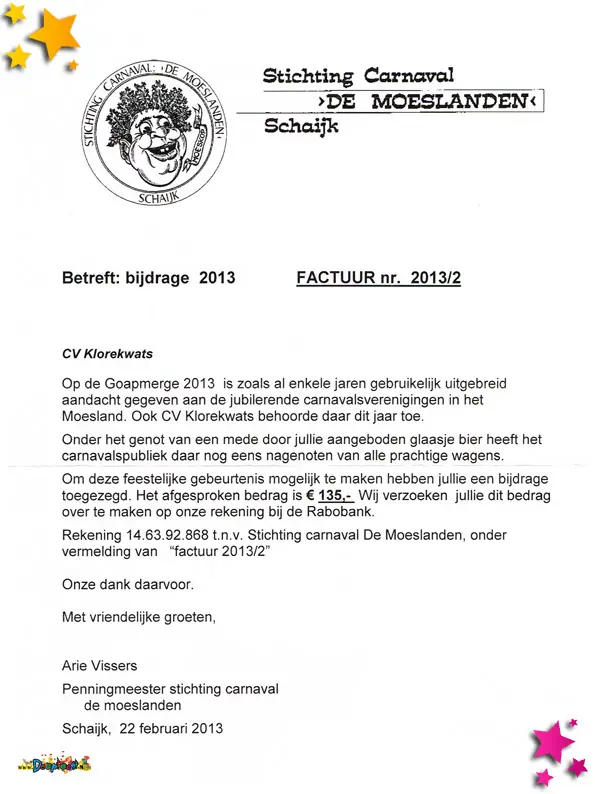 Een spraakmakend document uit dit jaar is de flyer van carnavalsvereniging Klore Kwats, die in 2013 hun 33-jarig bestaan vierden. Althans, volgens henzelf. Volgens Stichting Carnaval De Moeslanden bestond de club echter “pas” 22 jaar, omdat de club eerder onder een andere naam actief was geweest. De stichting erkende die jaren onder oude naam niet mee, wat bij Klore Kwats natuurlijk totaal verkeerd viel – op z’n Moeslands.