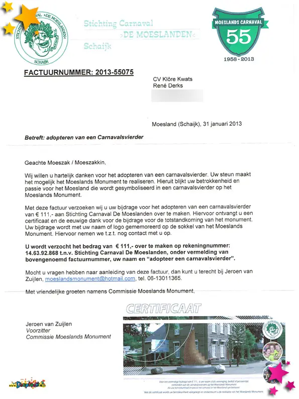 Factuur carnavalsvierder monument