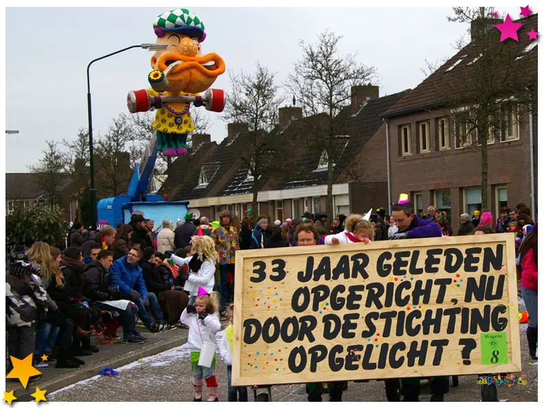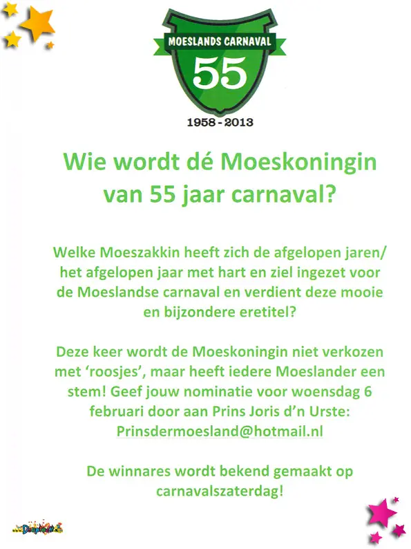 2013 was hét jaar van het 55-jarig bestaan van Stichting Carnaval De Moeslanden, maar ook het jaar waarin clubs én stichting elkaar liefdevol de loef afstaken. Een jaar vol speels verzet, symboliek en diepe waardering voor inzet binnen het Moeslandse carnaval.