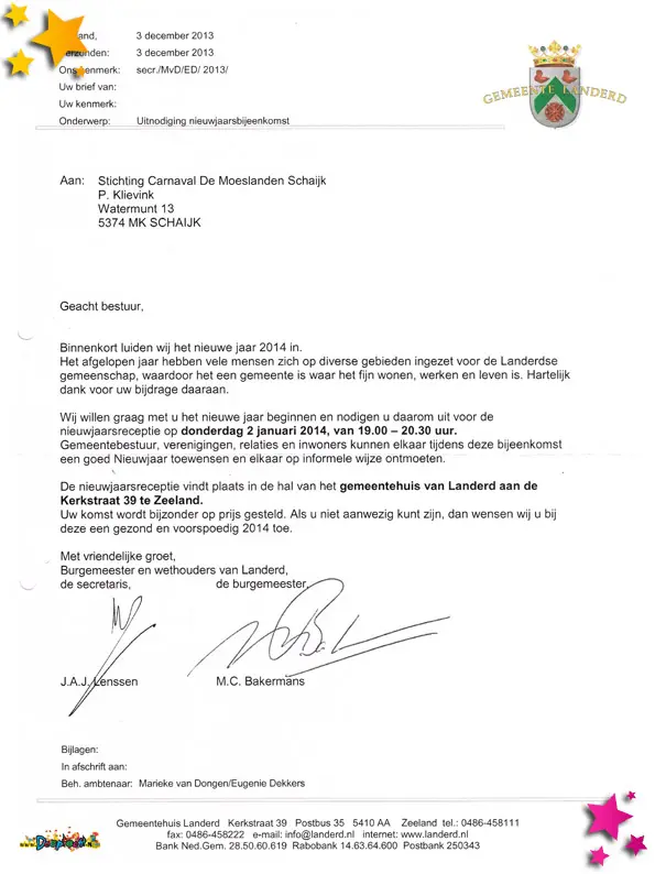 Uitnodiging voor de nieuwjaarsbijeenkomst van de gemeente Landerd.