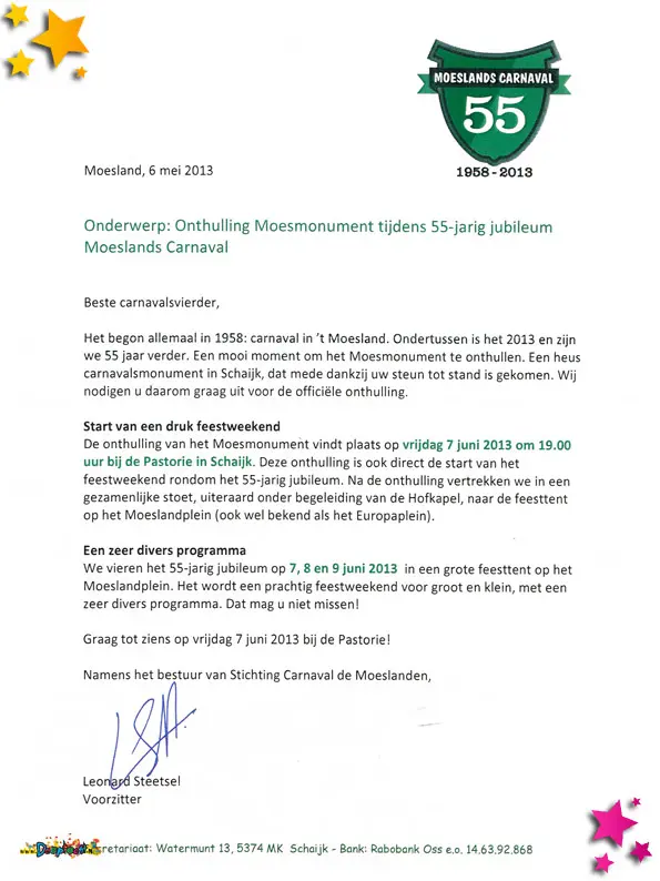De uitnodiging voor het bijwonen van de onthulling van het Moeslands Monument.