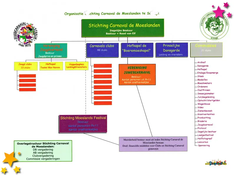 Een overzicht van de nieuwe organisatiestructuur van Stichting Carnaval de Moeslanden.