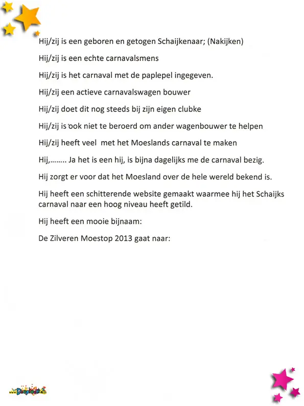 Daarnaast bevat het archief van 2013 een bijzonder moment van erkenning: de uitreiking van de Zilveren Moestop, de hoogste onderscheiding binnen het Moeslandse carnaval. De jaarlijkse ceremonie volgt altijd hetzelfde recept: een mysterieuze en humorvolle omschrijving van de ontvanger, waarbij stuk voor stuk verdiensten worden opgesomd zonder de naam te noemen. Pas op het allerlaatste moment wordt duidelijk wie de persoon is, én of het een man of vrouw betreft.