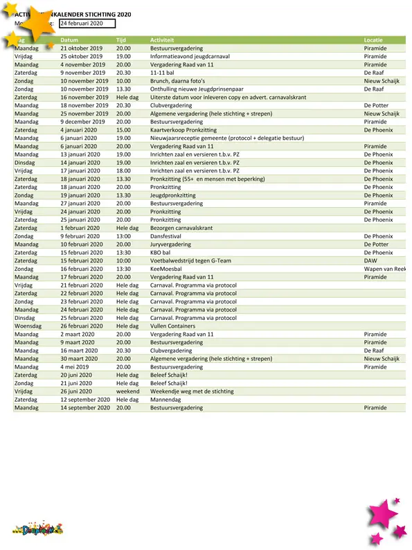 De activiteitenkalender van Stichting Carnaval de Moeslanden voor 2020.