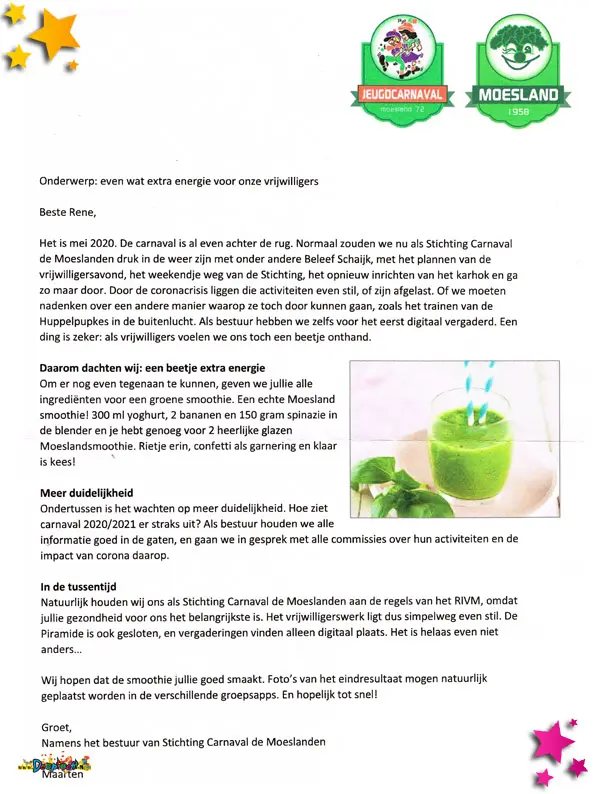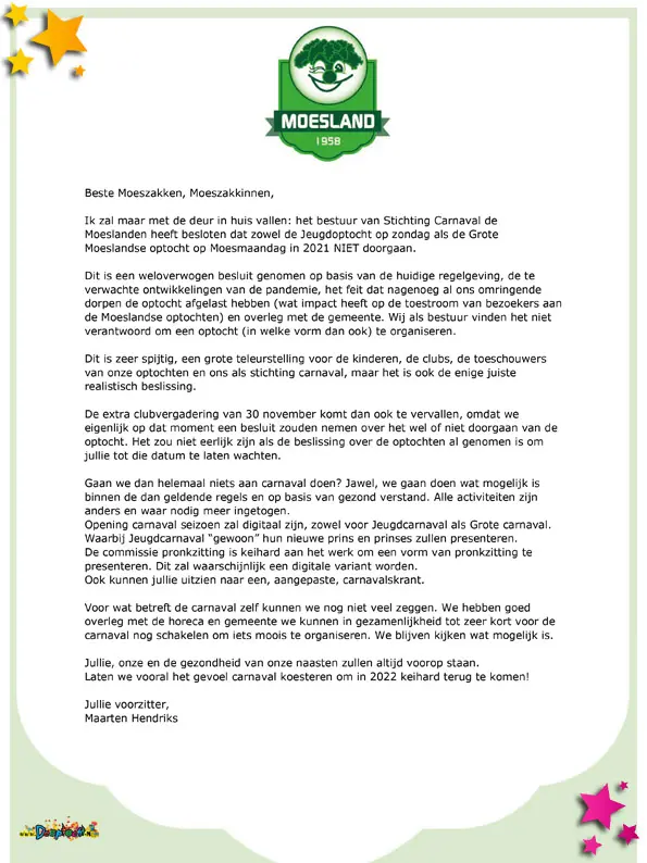 In het archief is een indringend document terug te vinden: de brief van voorzitter Maarten Hendriks, namens Stichting Carnaval De Moeslanden, waarin het besluit officieel werd meegedeeld. Eind 2020, met het coronavirus nog volop actief en veel onzekerheid rondom evenementen, werd al vroeg de knoop doorgehakt. Ook Jeugdcarnaval Schaijk maakte bekend de optocht af te gelasten.