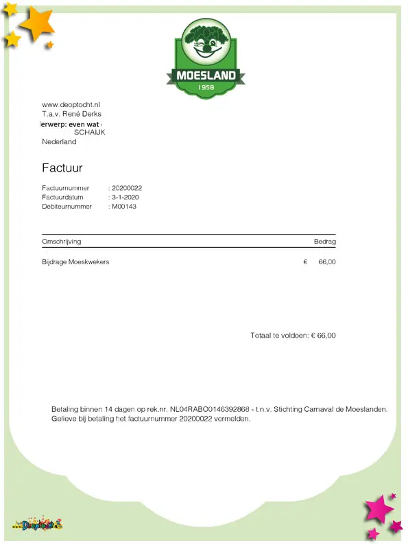 Hartstikke belangrijk en mooi natuurlijk al die Moeskwekers, maar wel boter bij de vis. Dit is de factuur voor de Moeskwekers.