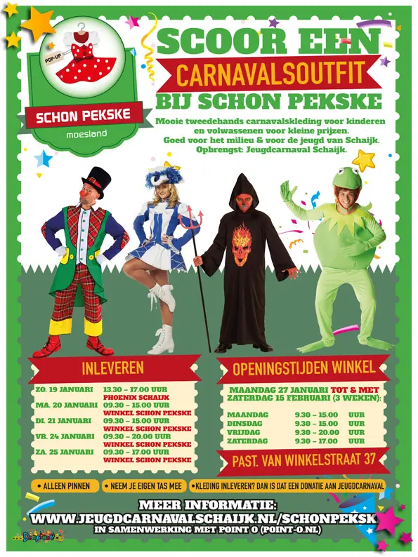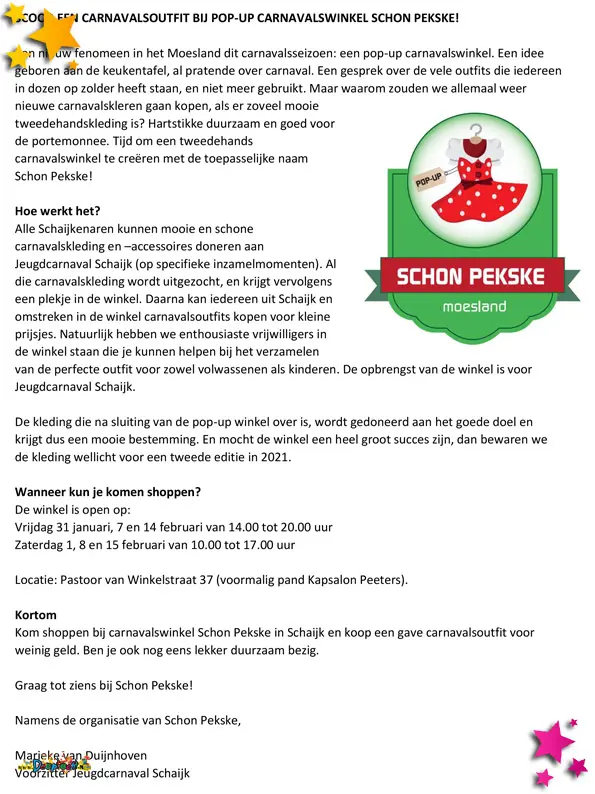 Een nieuw fenomeen in het Moesland dit carnavalsseizoen 2020: een pop-up carnavalswinkel. Waarom zouden we allemaal nieuwe carnavalskleren gaan kopen, als er zoveel mooie tweedehands kleding is? Hartstikke duurzaam en goed voor de portemonnee. Tijd om een tweedehands carnavalswinkel te creëren voor jong en oud met de toepasselijke naam Schon Pekske.