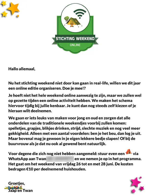 Leden (en aanhang) van Stichting Carnaval de Moeslanden gaan al vele jaren op weekendje. Echter door de Coronacrisis heeft de organisatie het dit keer iets anders moeten aanpakken. Een digitaal weekendje dit keer.