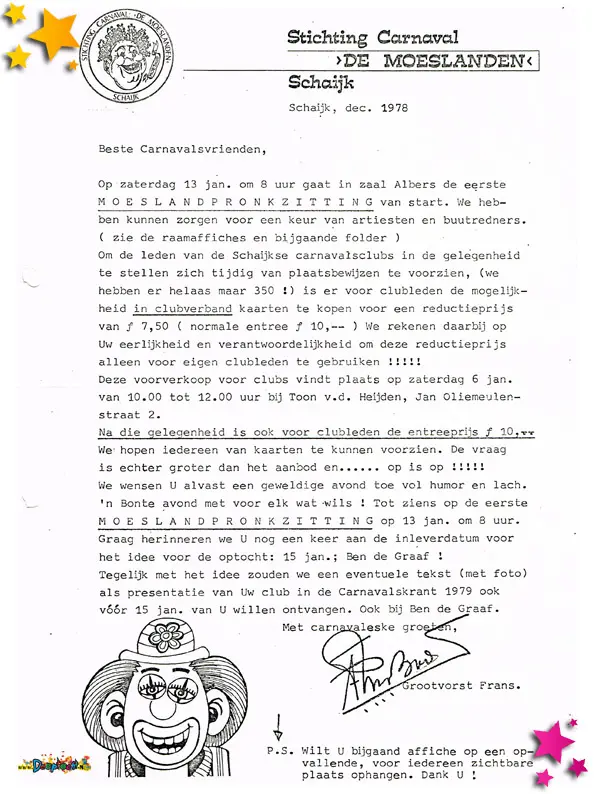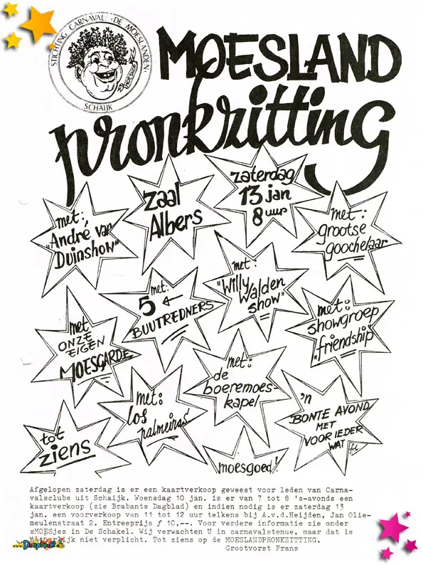 Pronkzitting 1979 bewees dat er in Schaijk ruimte was voor meer dan alleen optochten en feesten: er was behoefte aan een podium voor dorpshumor, satire en creativiteit. De avond legde de stevige basis voor een traditie die inmiddels niet meer weg te denken is uit de Moeslandse carnavalstijd. Het was een avond vol eerste keren, maar eentje die voelde alsof het altijd al zo had moeten zijn. De lat lag meteen hoog, de reacties waren lovend, en de belofte van vele volgende edities hing in de lucht. Een nieuwe Schaijkse traditie was geboren.