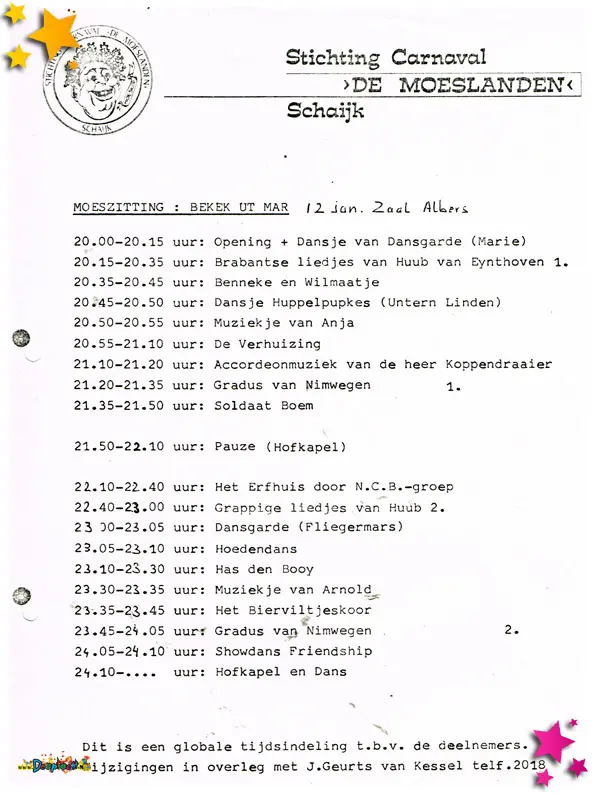 Pronkzitting 1980 was daarmee niet alleen een waardige opvolger van de eerste editie, maar zette meteen de toon voor wat een jarenlange traditie zou worden. En zoals het in het Moesland hoort: volgend jaar nóg mooier, nóg gekker en nóg gezelliger.