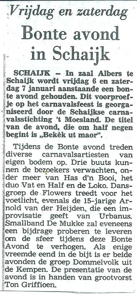 Naast de buuts bracht dansgroep De Flowers een wervelende show, en de jonge Arnold van der Heijden (15 jaar) verraste het publiek met een komische improvisatie in de stijl van Urbanus. Ook smallband De Mukke droeg bij aan de feeststemming met hun muzikale bijdrage.