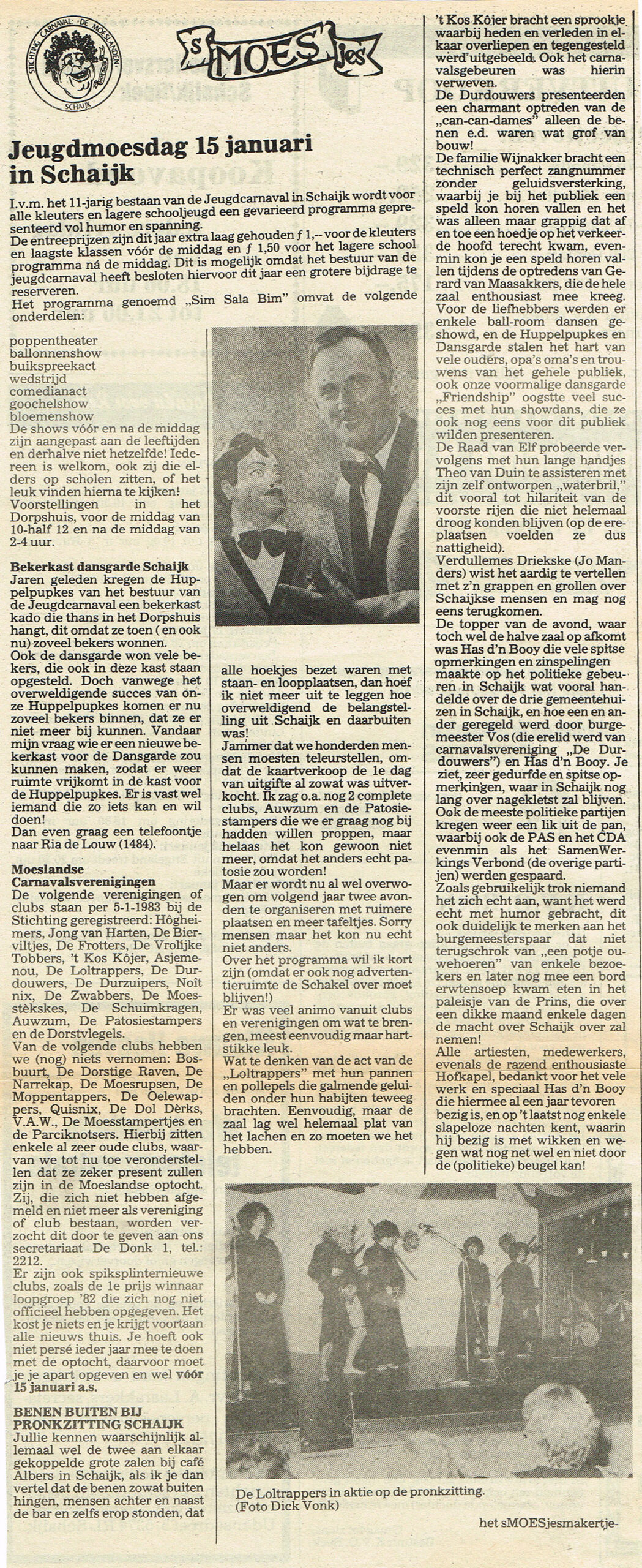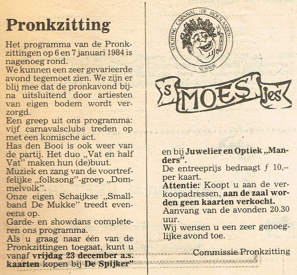 Pronkzitting 1983 bewees dat het Moesland bruist van lokaal talent, en dat het publiek nog lang niet is uitgekeken op wat er allemaal op het Schaijkse podium gebeurt.