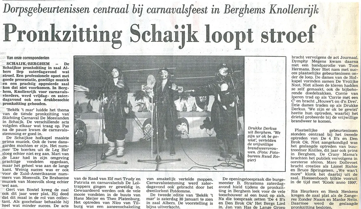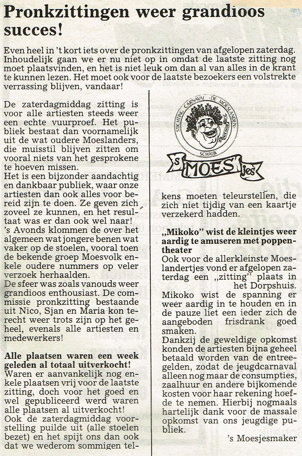 Hoe valt deze ‘rotkop’ anders uit te leggen als men de volgende meningen leest: „Een professionele opzet met goede presentatie, gezellige muziek en een prachtig opgesierde zaal. De Hofkapel met prima muziek. Twee dansgardes die er mochten zijn. Prachtige vond- sten van Mari van de Laar. De Brabantse nummers van het Moesvolk sloegen goed aan. Gert van Boxtel kreeg de zaal weer plat. De acts van de Loltrappers en Raad van elf met Patricia en Trudy gingen er geweldig in. Theo Platenburg en Hans Meijer werden gewaardeerd om hun mooie vondsten. Het optreden van Nico van Tilburg was een aaneenschakeling van smakelijk vertelde moppen. Carnavalsstemming werd ook gebracht door dweilorkest Poddomme.”