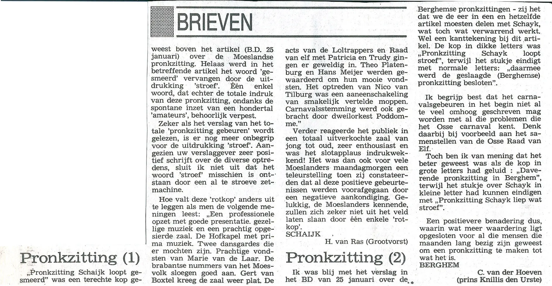 ,,Pronkzitting Schaijk loopt gesmeerd” was een terechte kop geweest boven het artikel (B.D. 25 januari) de Moeslandse pronkzitting. Helaas werd in het betreffende artikel het woord ‘gesmeerd’ vervangen door de uitdrukking ‘stroef’. Één enkel woord, dat echter de totale indruk van deze pronkzitting, ondanks de spontane inzet van een hondertal ‘amateurs’, behoorlijk verpest.