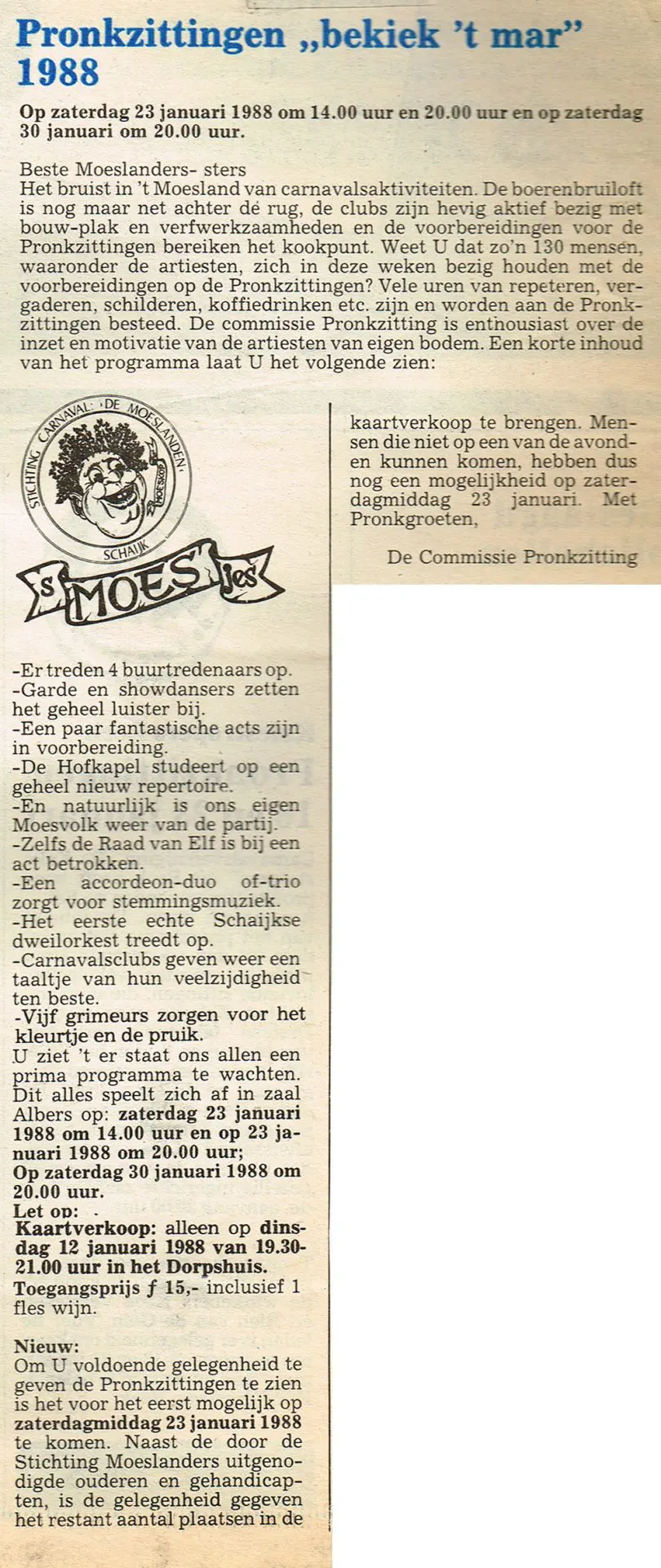 Pronkzitting 1988 vond plaats in een prachtig aangeklede Zaal Albers en stond dit jaar in het teken van het thema “Bekêk ’t mar”. Het was de tiende editie van de Moeslandse pronkzittingen, georganiseerd door Stichting Carnaval De Moeslanden. Ondanks een professionele aanpak, sfeervolle muziek en een uitstekende presentatie, kende de avond een wat stroef verloop in het eerste deel.
