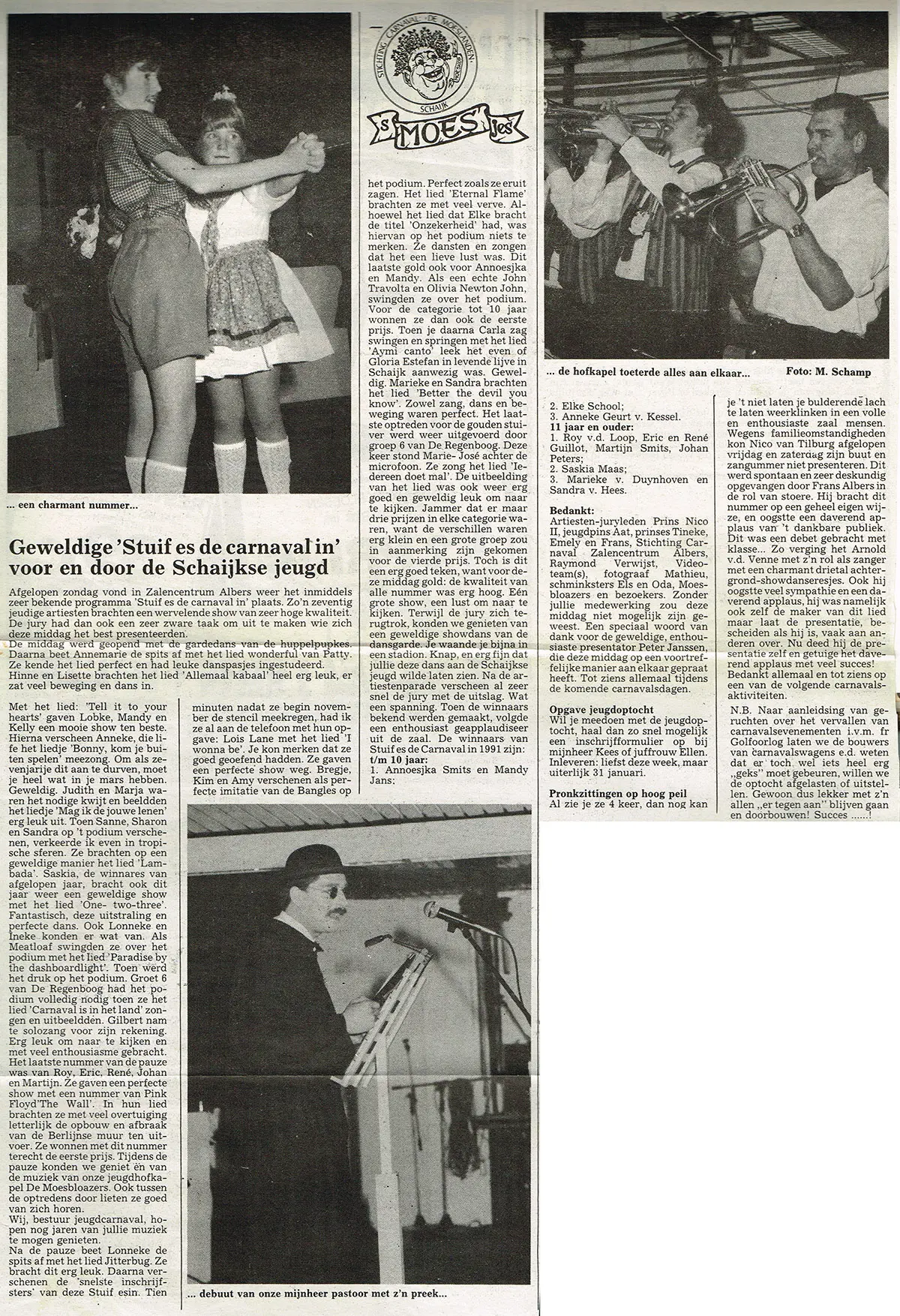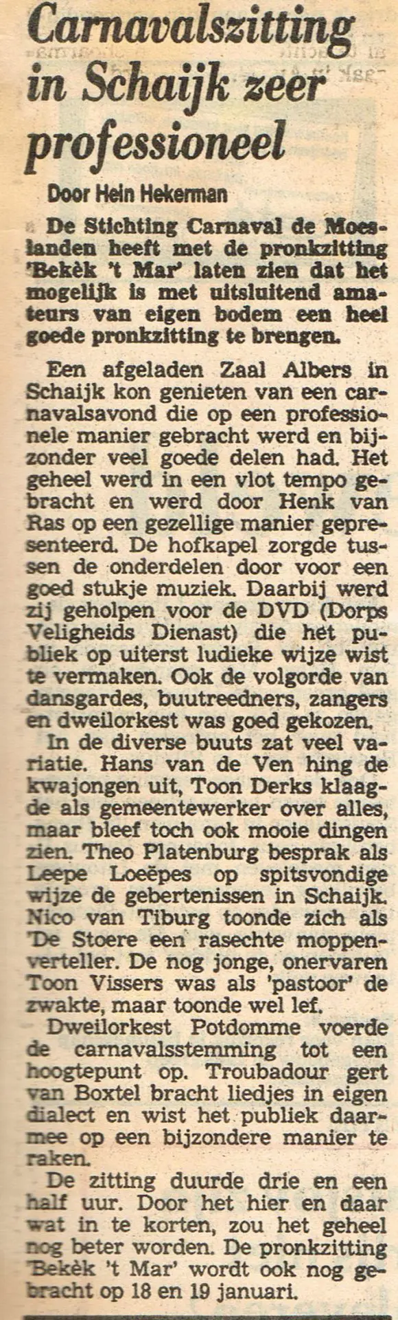 Pronkzitting 1991, getiteld “Bekèk ’t Mar”, bewees dat je met puur Schaijks talent een avondvullend carnavalsprogramma van hoog niveau kunt neerzetten. Stichting Carnaval De Moeslanden toverde een volle Zaal Albers om tot een feesttempel waar amateurartiesten van eigen bodem het publiek ruim drieënhalf uur lang vermaakten.