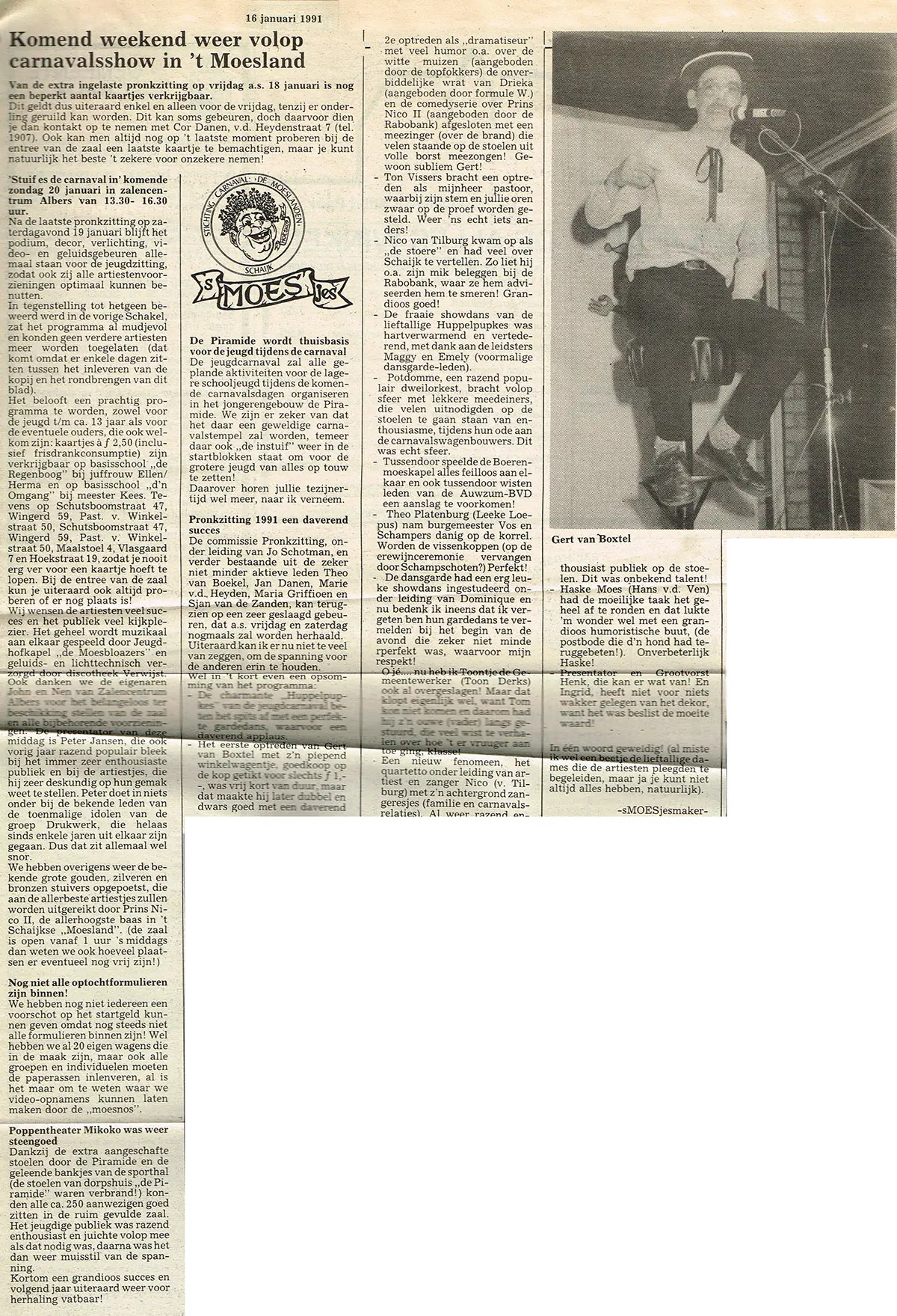 Op zaterdag 12, 18 en 19 januari 1991 worden om 20.00 uur in Zaal Albers de dertiende Moeslandse Pronkzitting gehouden. Dit waren de deelnemende artiesten: