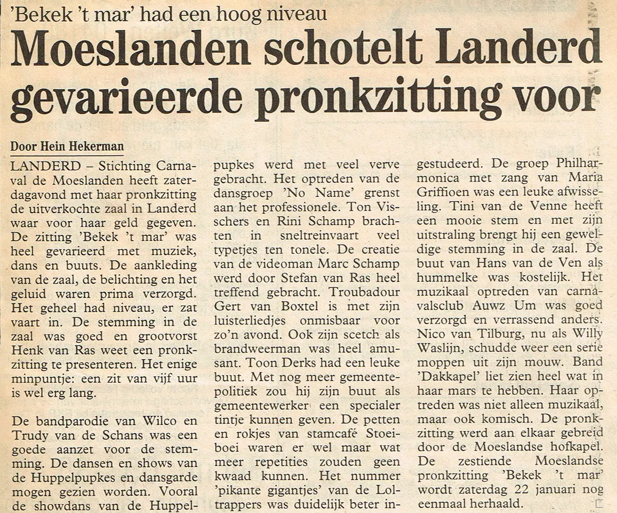 Pronkzitting 1994 bewees dat het Moeslandse podium nog steeds barst van talent. Voor wie het gemist heeft: op zaterdag 22 januari wordt deze succesvolle avond nog één keer herhaald.