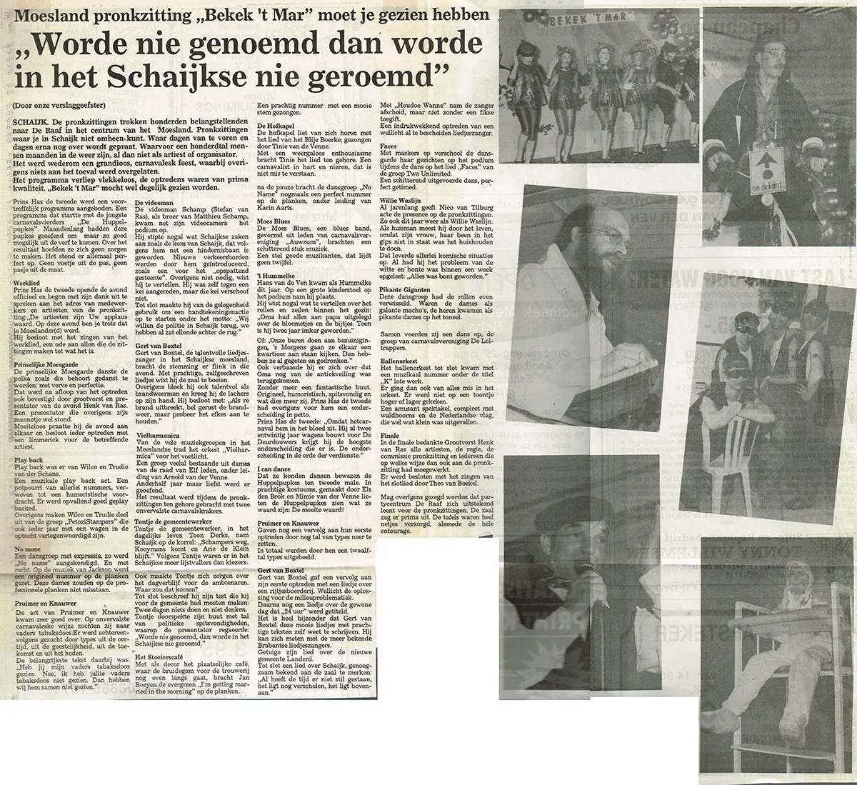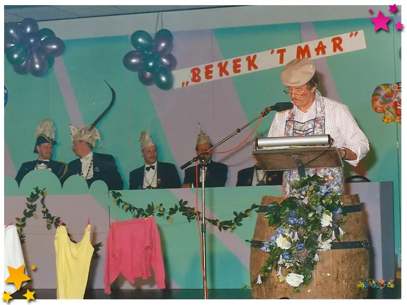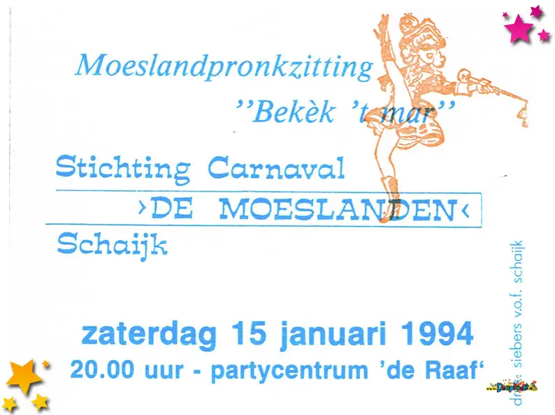 Pronkzitting 1994, de zestiende editie van Bekek ’t mar, werd zaterdagavond opgevoerd in een volledig uitverkochte zaal in Schaijk. Stichting Carnaval De Moeslanden bewees opnieuw dat het mogelijk is om met eigen Schaijks talent een avondvullend programma van hoog niveau neer te zetten. De aankleding, belichting en het geluid waren tot in de puntjes verzorgd. De sfeer zat er meteen goed in en de presentatie van grootvorst Henk van Ras verliep als vanouds soepel en enthousiast.