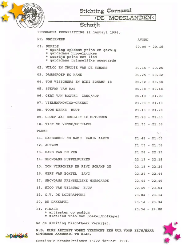 Op 15, 21 en 22 januari 1994 worden om 20.00 uur in Zaal Albers de zestiende Moeslandse Pronkzittingen gehouden. Dit waren de deelnemende artiesten: