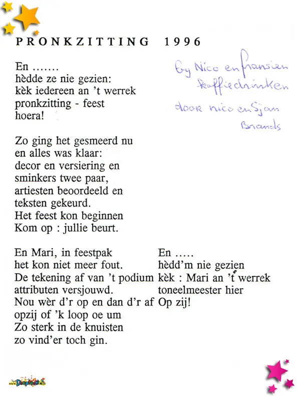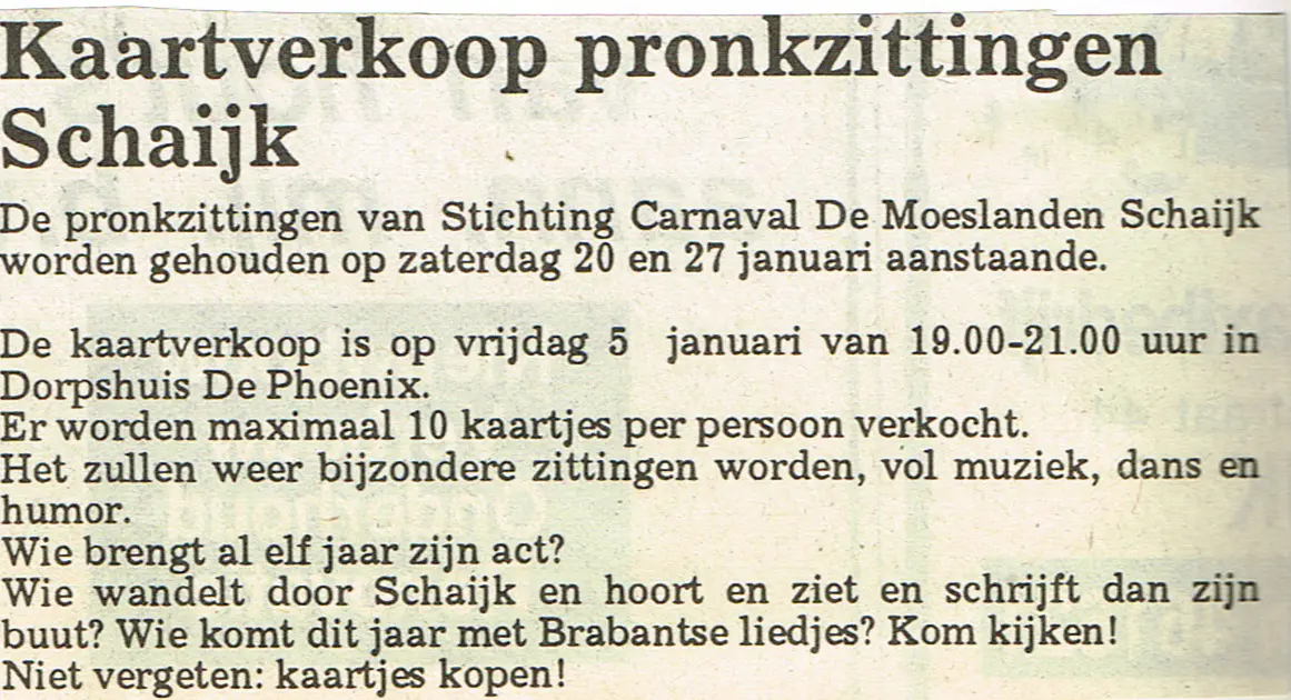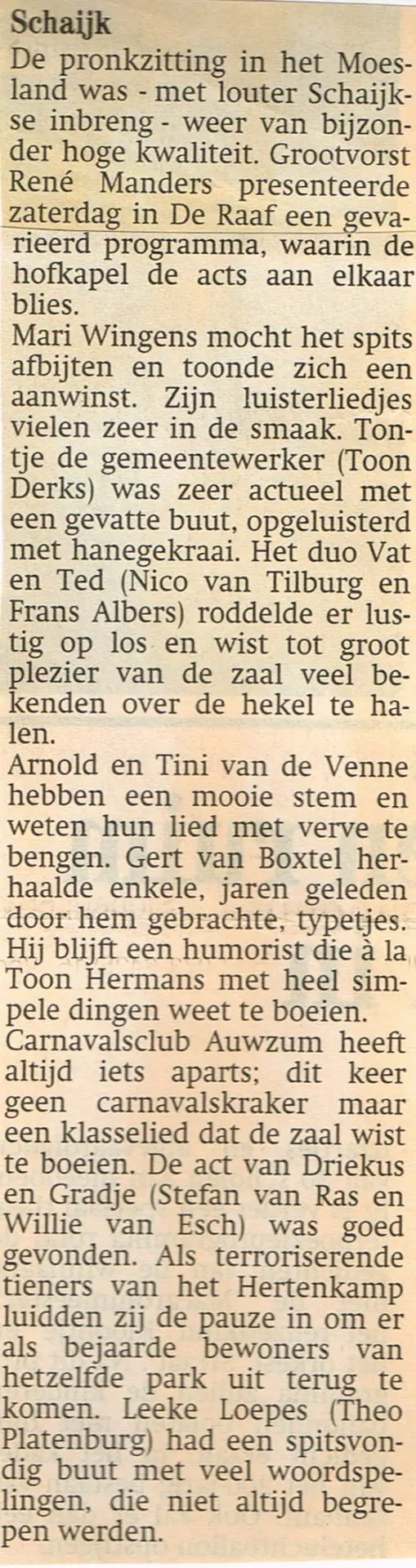 Pronkzitting 1996 bewees dat het Schaijkse podium nog altijd barst van creativiteit, muzikaliteit en humor. Met een goed tempo, sterke regie en een zaal die volop meeleefde, werd het een avond om trots op te zijn.