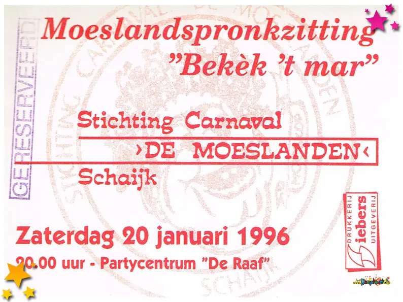 Pronkzitting 1996 in het Moesland bewees opnieuw dat Schaijk barst van lokaal talent. Met een volledig Schaijkse bezetting werd in De Raaf een avond van hoge kwaliteit neergezet. Grootvorst René Manders leidde de avond met flair en enthousiasme, terwijl de hofkapel het programma naadloos aan elkaar blies en voor muzikale sfeer zorgde tussen de optredens door.
