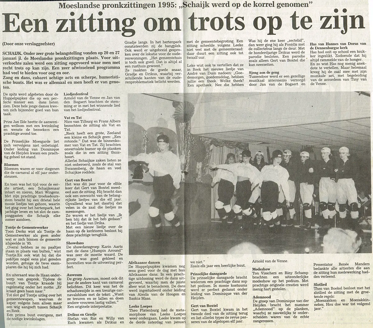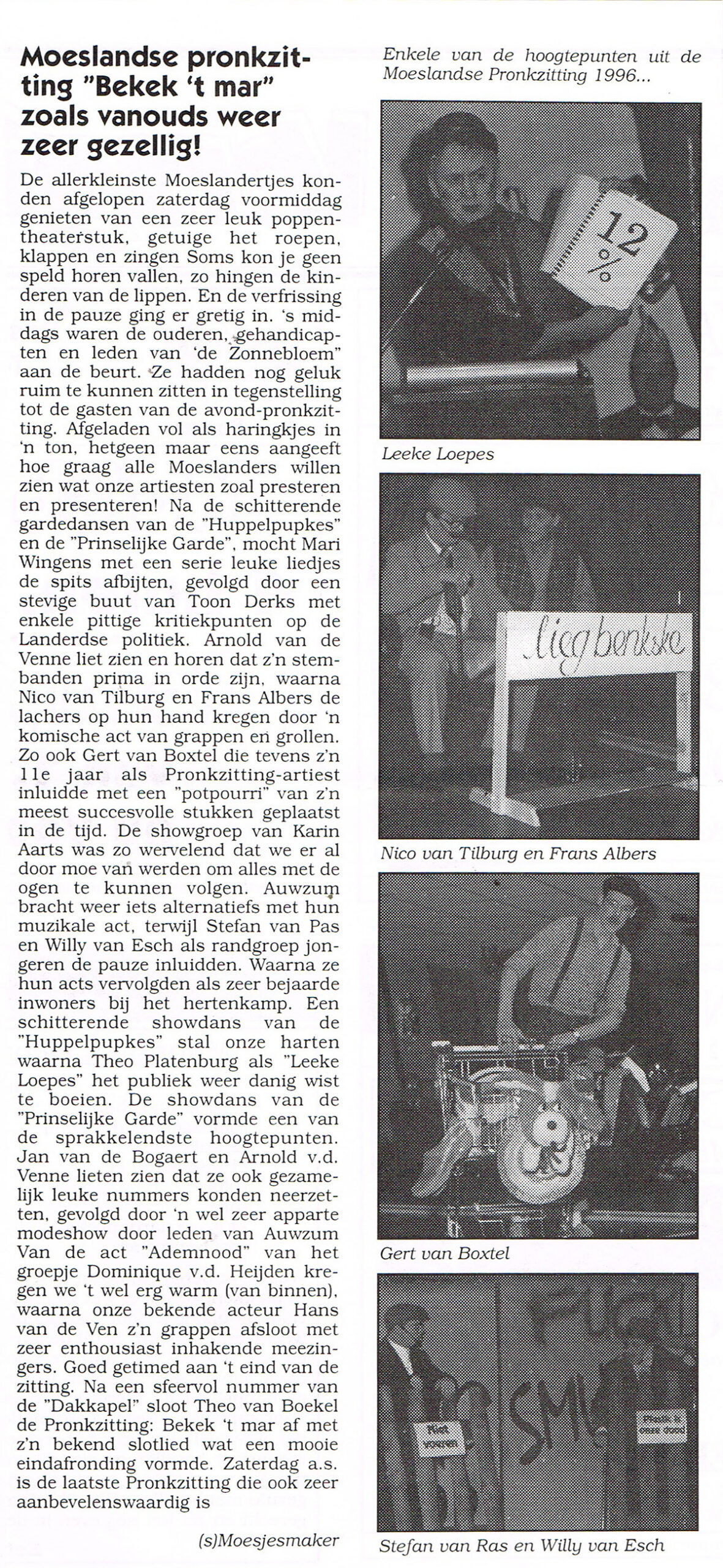 Op 20, 26 en 27 januari 1996 worden om 20.00 uur in Zaal Albers de achttiende Moeslandse Pronkzittingen gehouden. Dit waren de deelnemende artiesten: