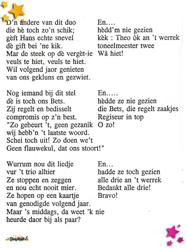 Toon Derks, in zijn vertrouwde rol als Tontje de gemeentewerker, bracht een scherpe en actuele buut, gelardeerd met onverwacht hanegekraai dat zorgde voor hilariteit in de zaal. Het duo Vat en Ted, bestaande uit Nico van Tilburg en Frans Albers, roddelde er in hun sketch vrolijk op los. Met scherpe opmerkingen en knipogen naar dorpsgenoten, wisten zij het publiek volop te vermaken.