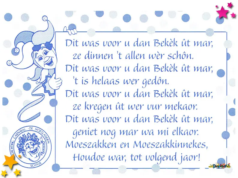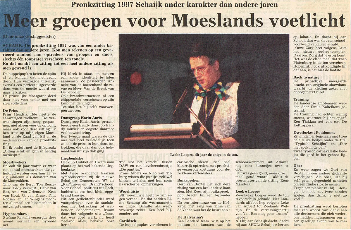 Pronkzitting 1997, de jaarlijkse editie van Bekék ’t Mar, bewees opnieuw dat de Moeszakken en Moeszakkinnen precies weten hoe ze het leven moeten relativeren. In een bomvolle zaal werd op zaterdagavond uitbundig gelachen om alledaagse dingen die, in een ander jasje gegoten, opeens een stuk luchtiger leken. De avond stond volledig in het teken van genieten, verbroedering en een gezonde dosis zelfspot.