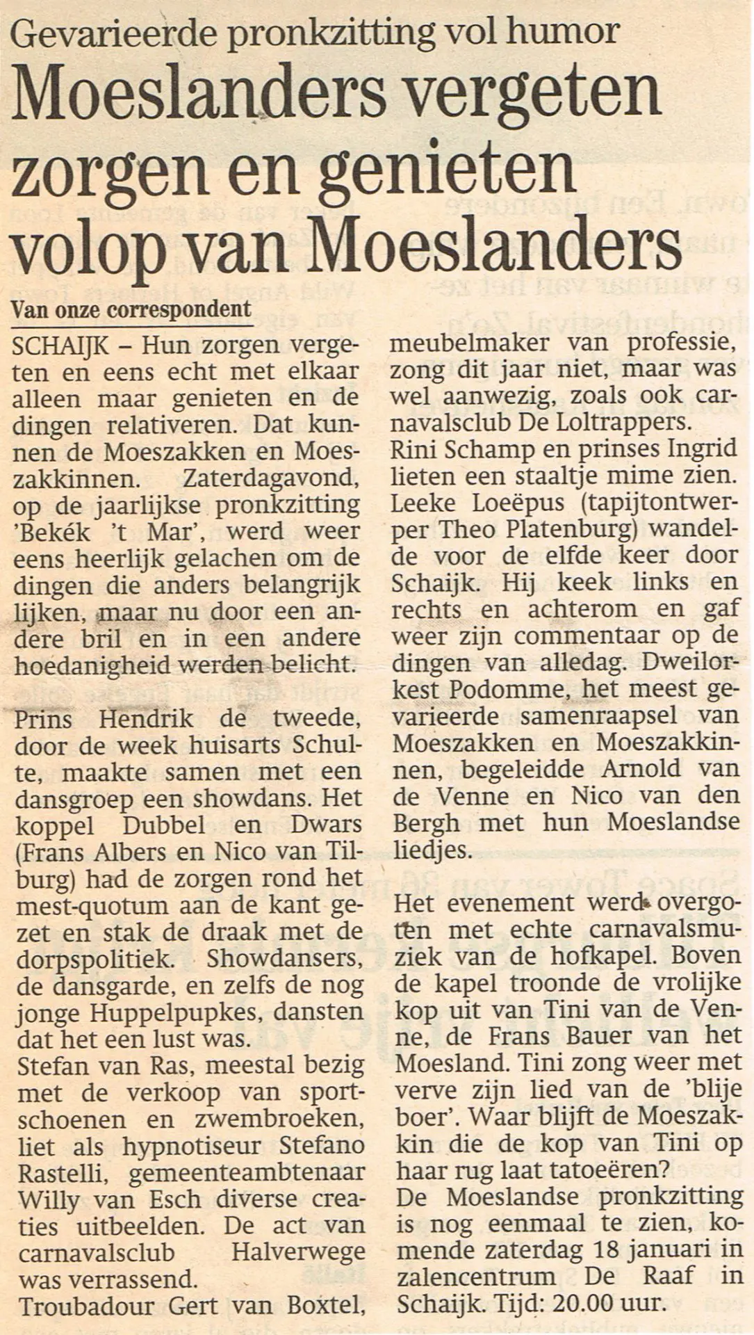 Een opvallend duo deze avond was Rini Schamp en prinses Ingrid, die samen een fraai stukje mime lieten zien, een subtiele en verfrissende toevoeging aan het programma. Daarna was het weer tijd voor een Moeslandse klassieker: Leeke Loeëpus, oftewel Theo Platenburg, liep voor de elfde keer door Schaijk. Met scherpe observaties, rake humor en zijn vertrouwde blik naar links, rechts en achterom, gaf hij commentaar op het dorpsleven zoals alleen hij dat kan.