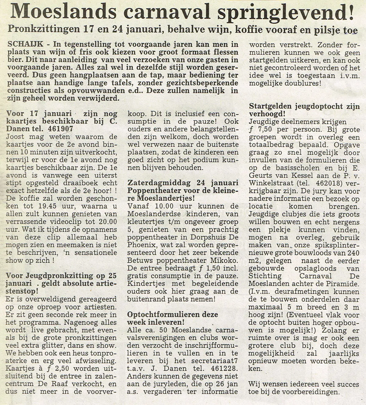 Op 17, 23 en 24 januari 1998 worden om 20.00 uur in Zaal De Raaf de twintisgte Moeslandse Pronkzittingen gehouden. Dit waren de deelnemende artiesten: