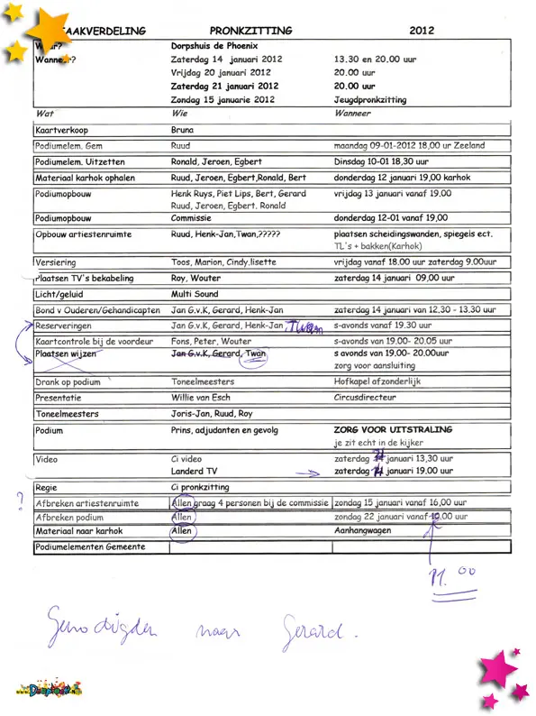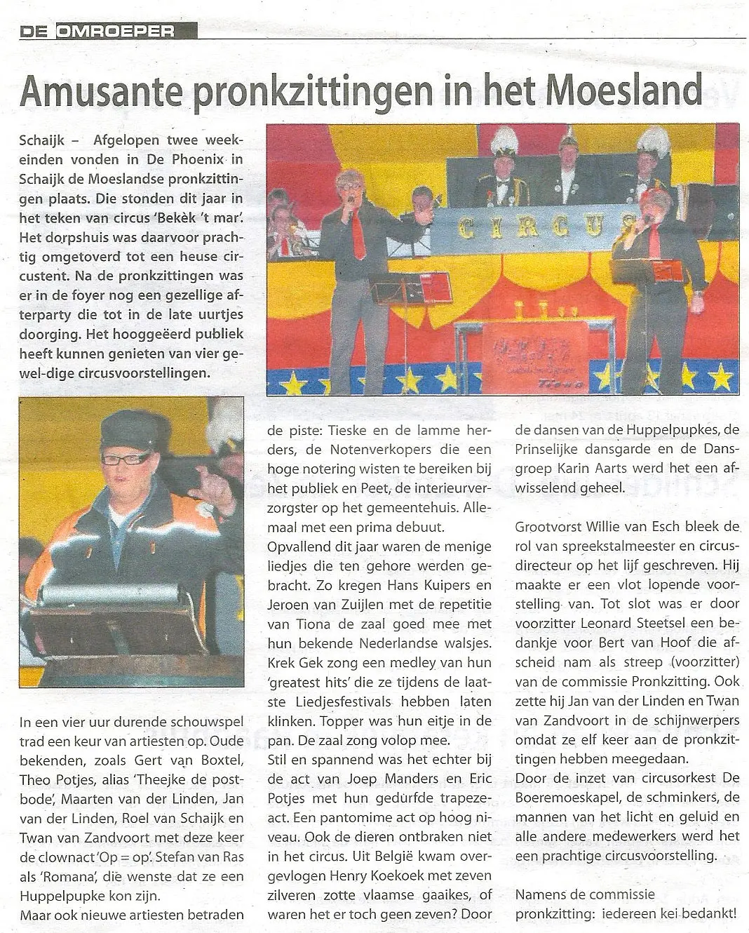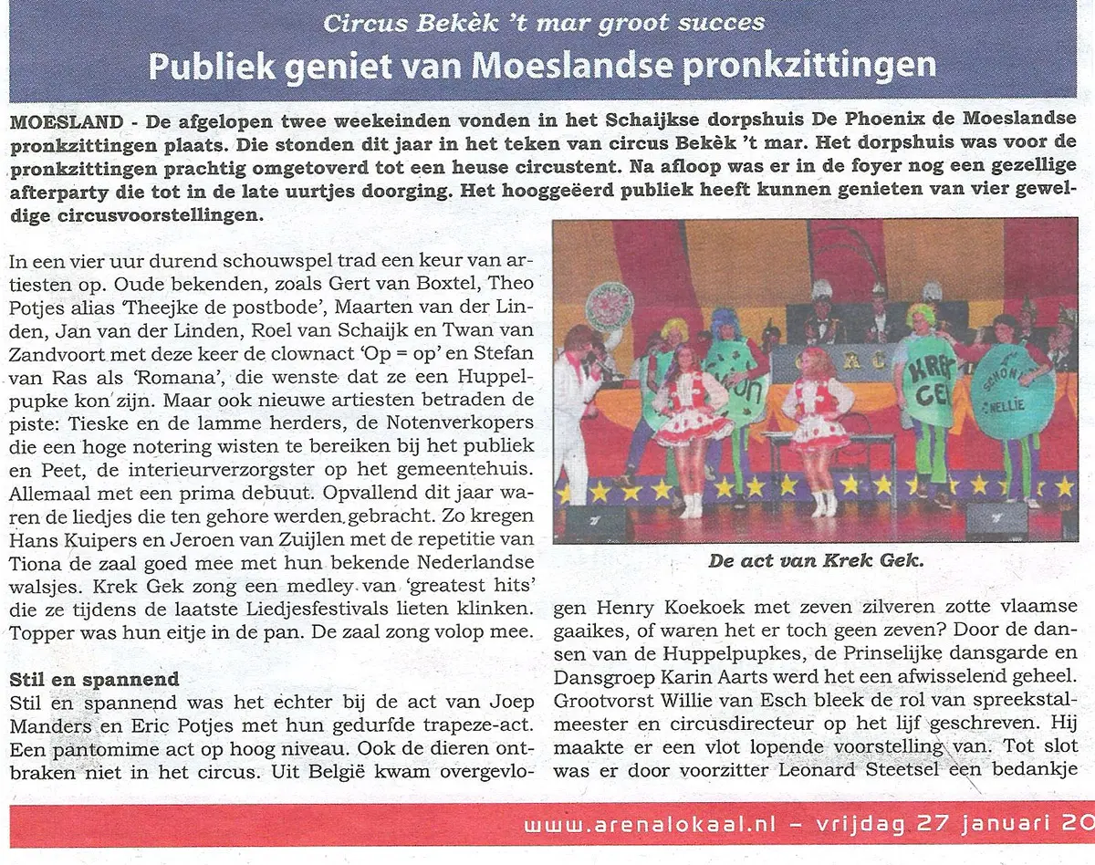 Pronkzitting 2012 stond volledig in het teken van spektakel, variété en verbazing, want het Moeslandse dorpshuis De Phoenix was voor de gelegenheid omgetoverd tot een échte circustent. Het thema Circus Bekèk ’t Mar bracht niet alleen visueel spektakel, maar ook inhoudelijk een creatieve en gevarieerde show die het publiek vier avonden lang wist te boeien.